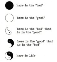 Нема добро без зло и обратно. Како би ја почувствувале и среќата ако не ја искусиме тагата? Мислам дека во секого од нас се кријат две страни, постојано се борат една со друга, некогаш победува едната некогаш другата, но не конечно... Сигурна сум, значи никој неможе да ме разубеди, дека постои човек што во животот не направил некое зло. Или ако ништо друго, барем почувствувал негативни емоции, што е и сосема нормално. Различни ситуации во животот не тераат да се однесуваме различно, лошо или добро, зависи. За се си има причина. Злото ќе постои засекогаш, исто како што ќе постои и доброто, затоа што едното без другото нема смисла.