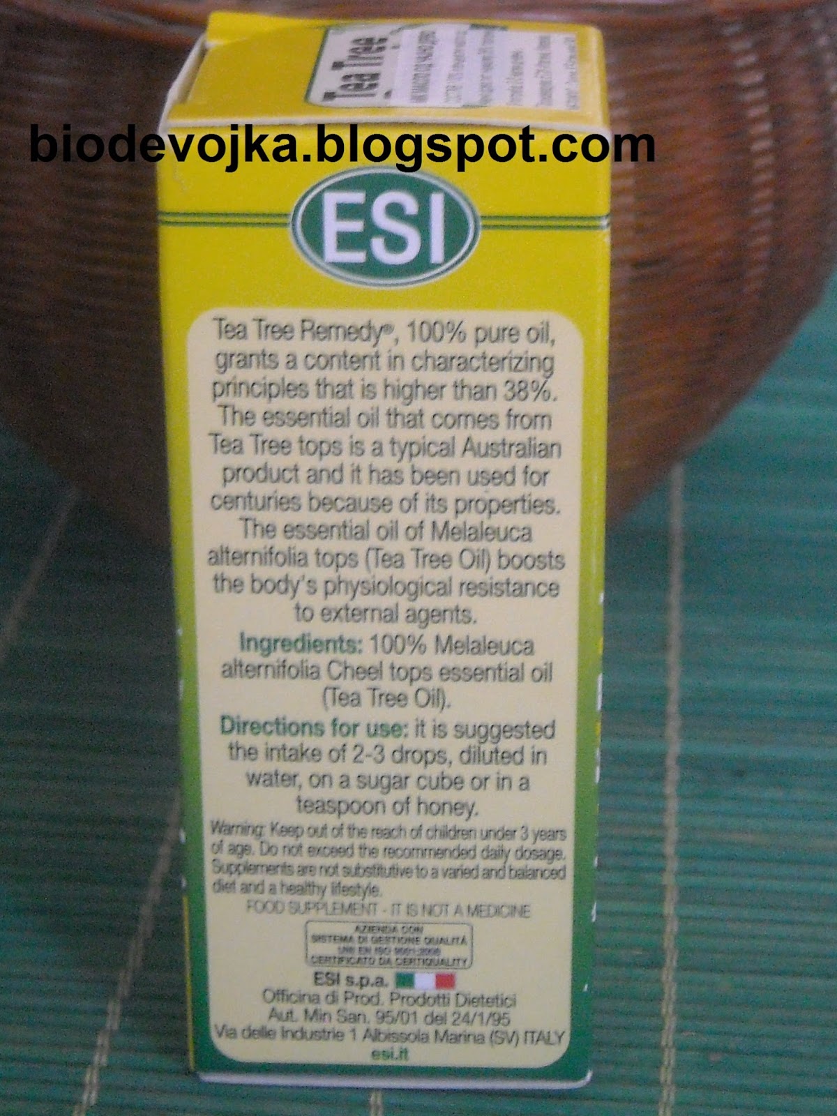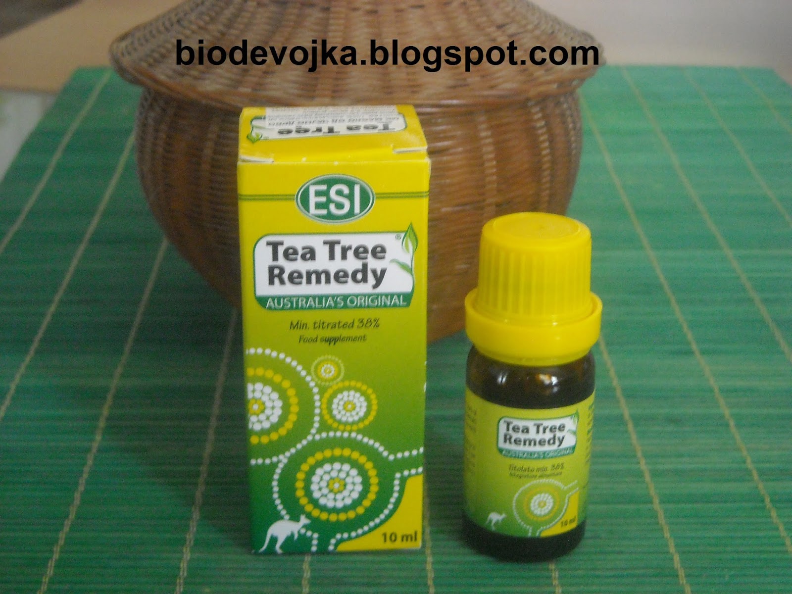 Како што ветив еме ме со рецензија на етеричното масло од чајно дрво и сите начини на употреба на истото во домот, како лек за здравје и во третманите за убавина. Поздрав и прекрасен викенд. Етерично масло од чајно дрво за здравје, убавина и како помош во домот Познато под името чајно дрво, ова етерично масло е екстрахирано од австралиската билка Мелалеука алтернифолиа, преку дестилација со водена пареа Има огромно антибактериско, антифугално, антивирално и антивоспалително дејство, од огромна корист е во третманите за здравје, убавина и како помош во домовите. Ова етерично масло е многу концентрирано како структура и состав и затоа се препорачува да се биде многу внимателни при неговата употреба и скоро секогаш да се употребува растворено во базно масло, алое вера гел, мед и др. (во зависност од намената). Ова етерично масло спаѓа меѓу оние најценетите во ароматерапијата кој го балансираат организмот (на физичко и психичко ниво), и според филозофијата на ароматерапијата, ова етерично масло е во можност да им помогне на одредени личности да се справат со проблемите од психофизичка природа. Етеричното масло од чајно дрво обично се продава во мало темно шишенце затоа што е чувствително на светлина и на тој начин ги задржува квалитетот и составот. Пред да преминам на оној дел во кој ви кажувам на кои сѐ начини може да го користите ова етерично масло, би сакала да кажам збор два за едно многу убаво етерично масло од чајно дрво кое го открив неодамна и го купив пред некој ден со цел да го истестирам, односно етеричното масло од чајно дрво на ESI. Како што веќе знаете јас секогаш ги купувам етеричните масла на марката Флора, меѓутоа со оглед на тоа што сакам да ви дадам повеќе избор и да пробам нешто ново, се решив да го истестирам ова етерично масло. Ова етерично масло доаѓа во пакување од 10 мл. во темно шишенце со многу мал отвор кој дозволува контролирана употреба ма самото масло со оглед на тоа што, како што веќе реков, е доста концентрирано и доволна е сосема мала количина. На самата опаковка пишува дека станува збор за 100% чисто етерично масло и сега ќе направиме тест за да се увериме дали е така. Доколку се сеќавате во статијата за етеричните масла ви откив еден мал трик како да препознаете дали едно етерично масло е чисто или продолжено со друго масло. Тестот се состои во следново: на еден лист се капнува една капка од етеричното масло и доколку капката веднаш се рашири на самиот лист е прв знак за чистотата на маслото. Листот се остава цела вечер така и изутрината, доколку дамката потполно е исчезната значи дека маслото е чисто. Доколку има масна дамка (како онаа од зејтин) на местото каде сте капнале, во тој случај етеричното масло не е чисто и разредено е со некое друго базно масло. Еве ги резултатите од ова етерично масло: вечерта капнав една капка на еден бел лист која веднаш се рашири на самиот лист изутрината дамката комплетно ја немаше. Ова е одличен знак за чистотата на етеричното масло, како што и пишува на самата опаковка. Интересен е фактот што овој вид на етерично масло содржи повеќе од 100 супстанции, од кои онаа која е присутна во најголема количина е терпинен-4-ол кој претставува најмалку 30% од составот на маслото. Во ова етерично масло, назначено е дека оваа состојка е присутна повеќе од 38%. Има многу јак мирис. Откако ги разгледавме со