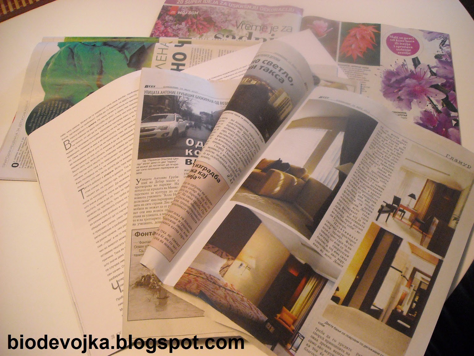 Здраво на сите, колку прекрасна тема. Еве и јас сакам да споделам со вас два направи сам проекти кои се ептен лесни а прекрасно изгледаат. Поздрав Направи сам: уметничко дело од стари весници и списанија Дали имате еден куп на стари весници и списанија со кои не знаете што да направите? Прво нешто што ви паѓа на памет е да ги фрлите нели??? Не не, немојте. Јас имам еден оригинален предлог за вас за уметничко дело кое е направено токму од стари непотребни хартии од весник или списание. Идеата за ова нешто ја добив откако во Рим видов едно уметничко дело во кое покрај весникот имаше и стари копчиња, парчиња од текстил и волна. Со оглед на тоа што сакав да направам нешто многу поедноставно, се одлучив само за весникот. Потребни нешта за реализација на овој проект се: - стари весници или списнија кои може да бидат во боја или црно бели во зависност од вашата желба и потреба: - лепак; - ножици; - еден молив (нема да ви треба за цртање туку за нешто сосема друго); Земете еден лист од весникот или списанието и на работ од истиот ставете го моливот и почнете да виткате се додека да се потроши хартијата. Кога ќе стигнете до крајот на листот, нанесете лепак и извадете го моливот од внатре. Направете многу вакви “стапчиња од хартија“ и на еден картон, стиропор или даска, почнете да ги лепете во различни насоки како вам ви се допаѓа и ви одговара. Како што веќе напоменав, може да користите црно бели списанија или во боја во зависност од вашата желба и бојата на намештајот каде сакате да го закачите ова уметничко дело. Јас се одлучив за црно бела варијанта затоа што ми изгледаше многу поинтересно онаму каде што сакав да ја закачам, а и одговараше со мебелот. Еве го крајниот резултат на она што јас го направив: Толку едноставно, а навистина многу интересно . Понекогаш доволно е навистина малку да го разубавиме просторот каде живееме и работиме. Се надевам дека оваа идеа ви се допадна и дека доколку имате навистина многу списанија, наместо да ги фрлите ќе се обидете да направите нешто вака интересно. Поздрав и до следната статија Вики Направи сам: држач за салфетки Прекрасна вечера, убава атмосфера, пријатели, вкусна храна и прекрасно уредена маса... Денешниов проект кој сакам да го споделам со сите вас е како сами да направите држач за салфетки на најлесен можен начин и со малку пари, кој притоа ќе исгледа многу убаво на вашите маси. Се она што ви е потребно да го направите : 1. неколку ролни од тоалетна хартија (картонскиот остаток од хартијата); 2. убава украсна хартија која ќе одговара со салфетите кои ќе ги поставите како декорација; 3. еден пар ножици 4. лепак 5. 10 минути од вашето време Картонот од тоалетната хартија го сечете на две половини. Украсната хартија ја мерите и сечете според димензиите на ролната, ја премачкувате со лепак и ја лепите врз самата ролна. Во секој од вака подготвените држачи ставате по една убава салфета или крпа и ја поставувате на масата. Навистина оригинално, а толку едноставно за правење. Одберете ги вашите омилени бои и слободете ја вашата фантазија. Пријатна вечер Вики