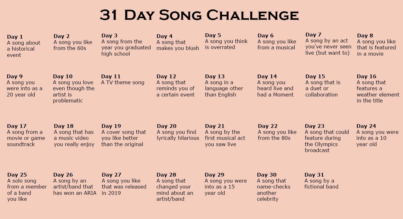 Јас каснам малку,ама ќе се надополнам Day 4: A song that makes you blush Perfect-Ed Sheeran Day 5: A song you think is overrated Flowers-Miley Cyrus Day 6: A song you like from a musical I Dreamed A Dream(Les Misérables) Day 7: A song by an act you've never seen live (but want to) Не го разбирам баш ова.Некој да појасни? Day 8: A song you like that is featured in a movie Wildest Dreams-Taylor Swift Day 9: A song you were into as a 20 year old Уште нешто што не можам да го исполнам Day 10: A song you love even though the artist is problematic YUNGBLUD-Kill Somebody Day 11: A TV theme song Stranger Things Theme Song Day 12: A song that reminds you of a certain event Love Story-Taylor Swift Day 13: A song in a language other than English Игри без граници-Тоше Проески Day 14: A song you heard live and you had a moment Што Сака Нека Биде-ДНК Day 15: A song that is a duet or collaboration Karma-Taylor Swift & Ice Spice Day 16: A song that features a weather element in the title Midnight Rain-Taylor Swift Day 17: A song from a movie or game soundtrack I Don't Wanna Live Forever-ZAYN & Taylor Swift Day 18: A song that has a music video you really enjoy Celestial-Ed Sheeran